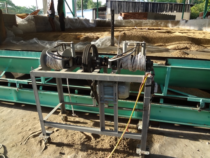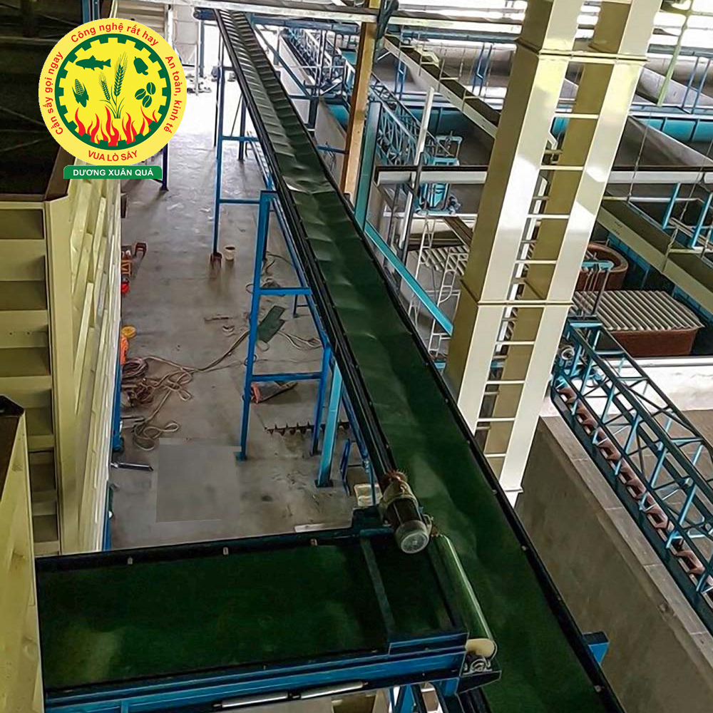 - Băng tải nghiêng: dùng để vận chuyển nguyên liệu lên xuống giữa các tầng sấy.